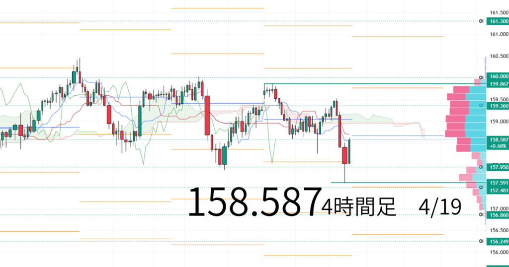 4時間足では159円に抵抗となる雲が見受けられ、短期的な上値を抑える要因になるかとみられます。
